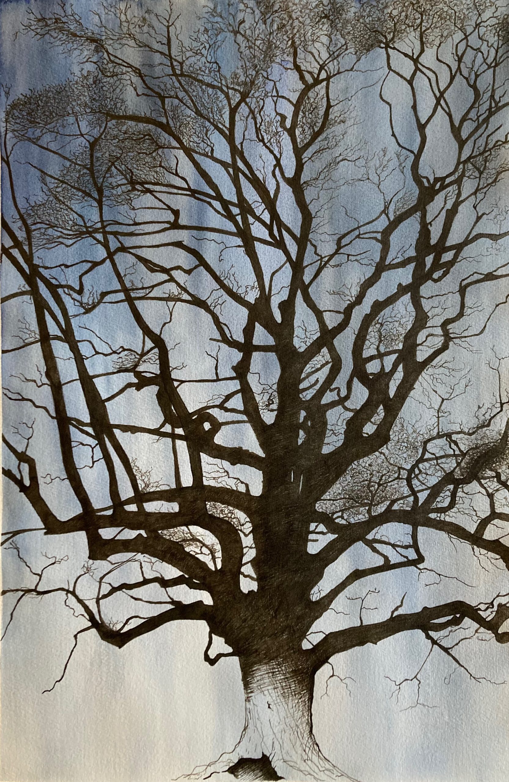 Image: Hugo Trees, ink on watercolour, 22 x 15″, by Louisa Trotter.