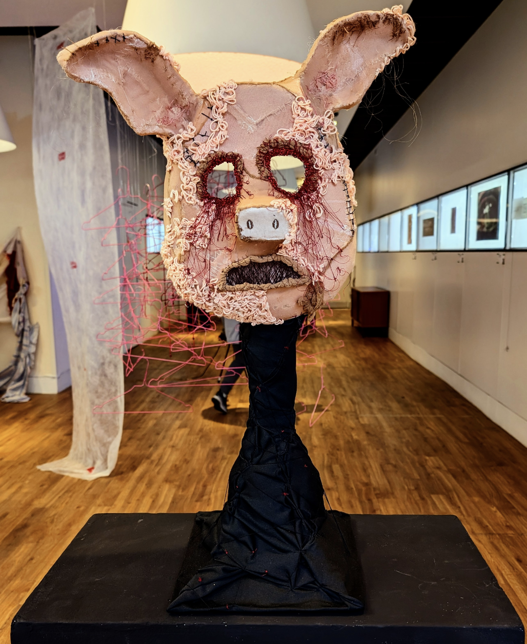 Image: The Waiting Watchers, Recycled cardboard/paper, repurposed pig toy skin, nylon tights, yarn, threads, video and sound.